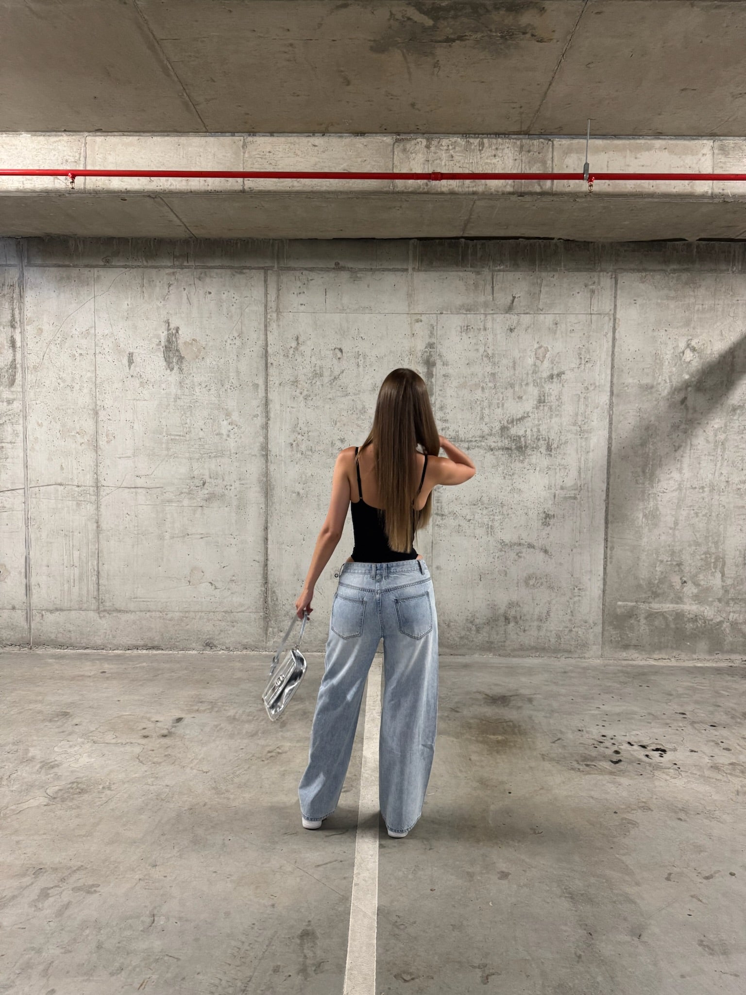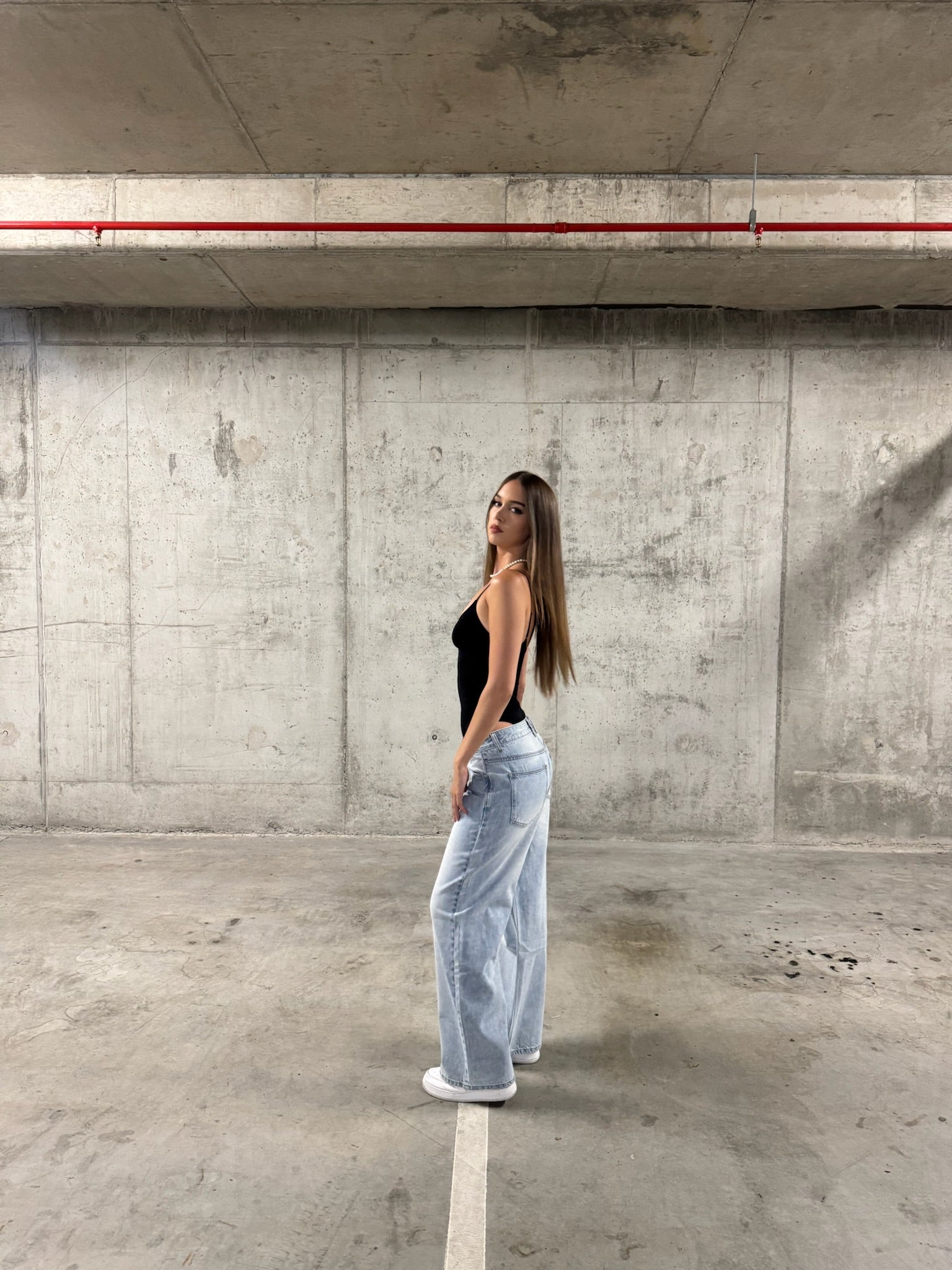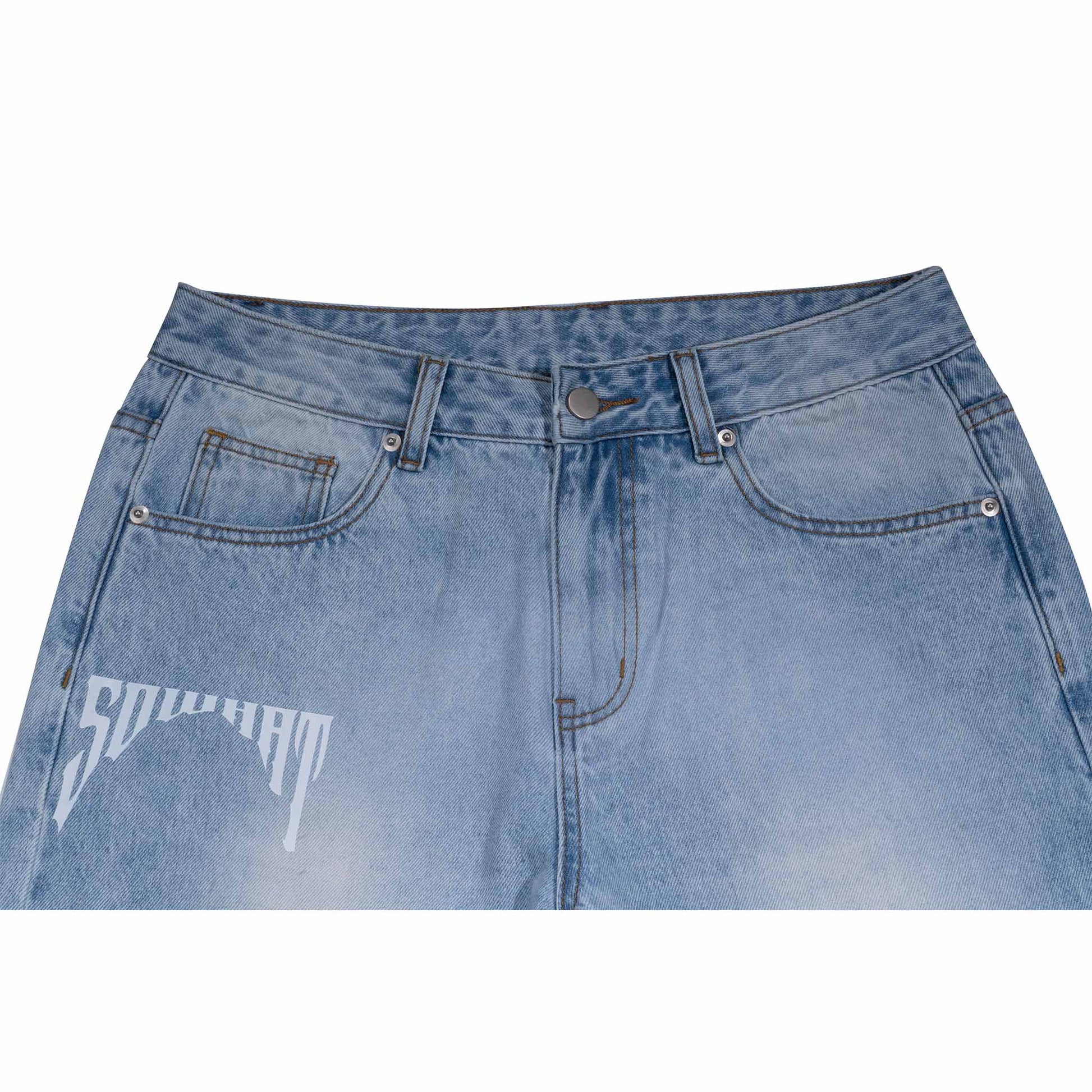 This large straight jeans is embellished with the pattern based on our brand's iconic LOGO. The front pants use the characteristics of denim, rinse and spray white, and make the original blue of denim into a gradual change of blue and white fading, making the denim itself simple but not lose texture; especially suitable for people who need basic styles with different scenes.