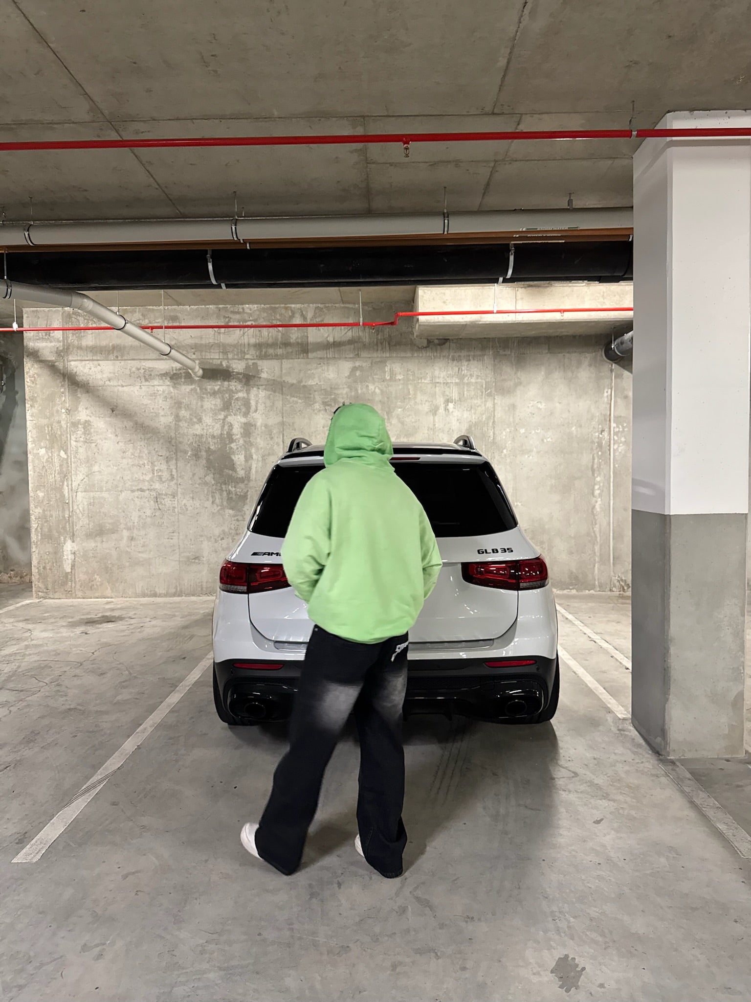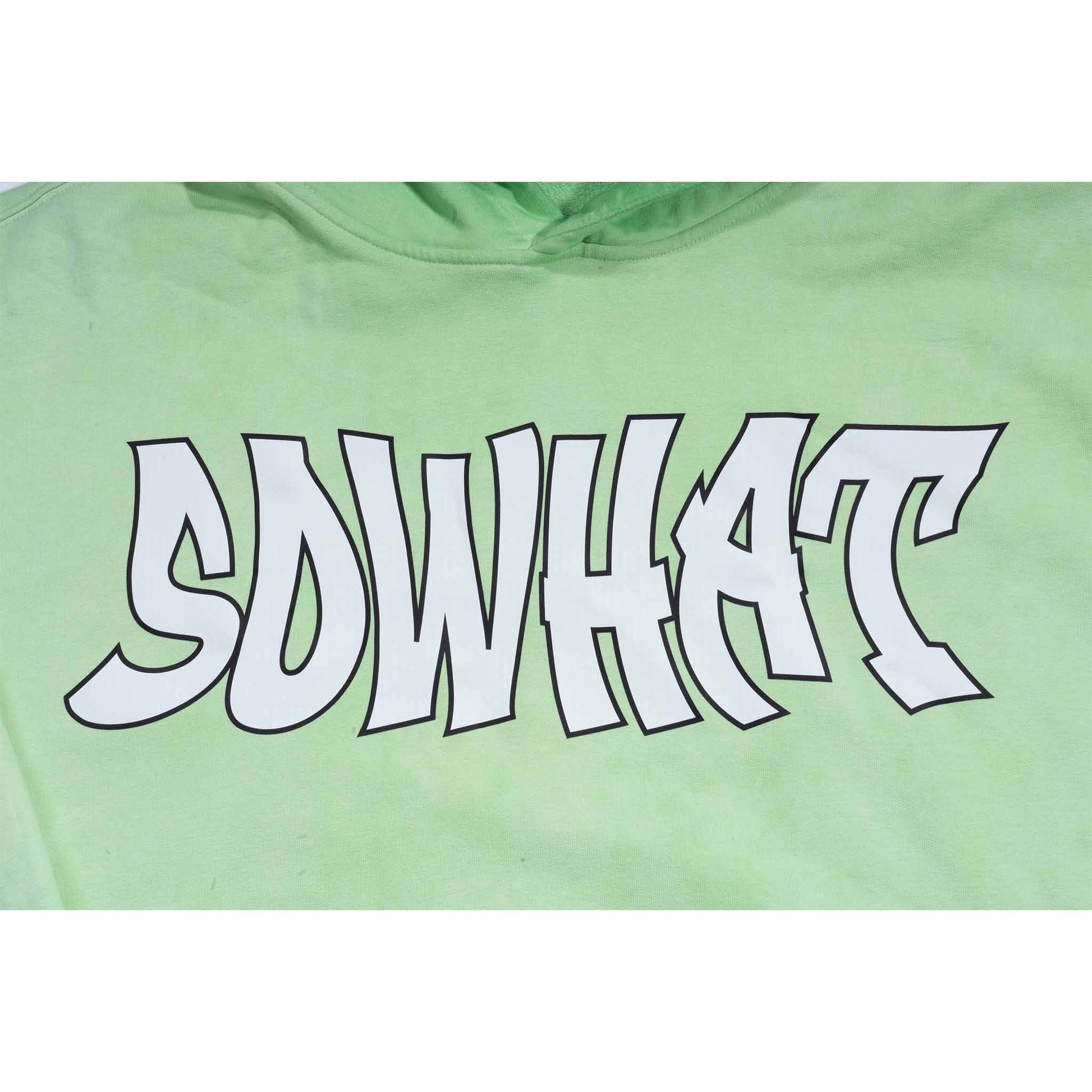 Green reversed background fleece hoodie with anti-bottom frying process.