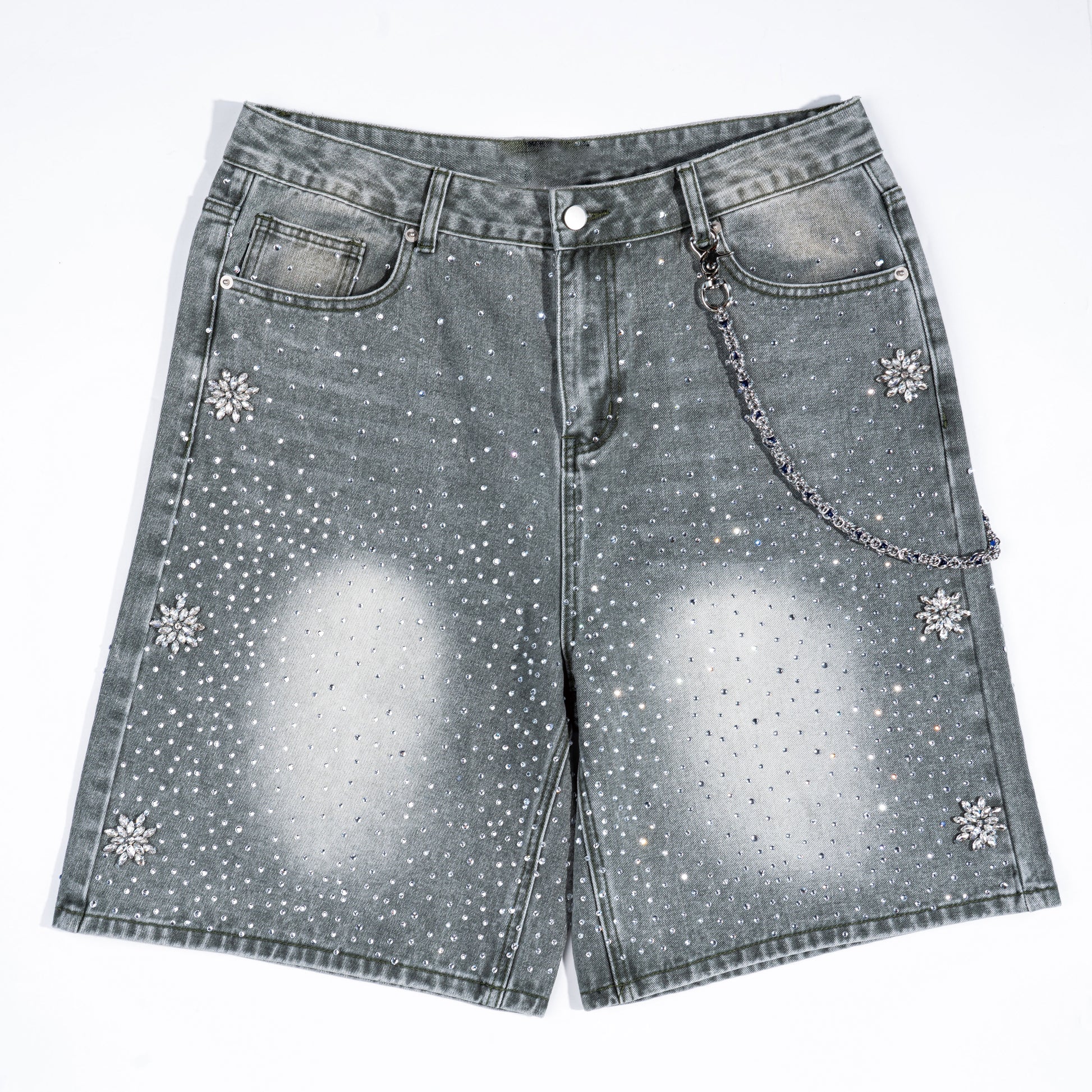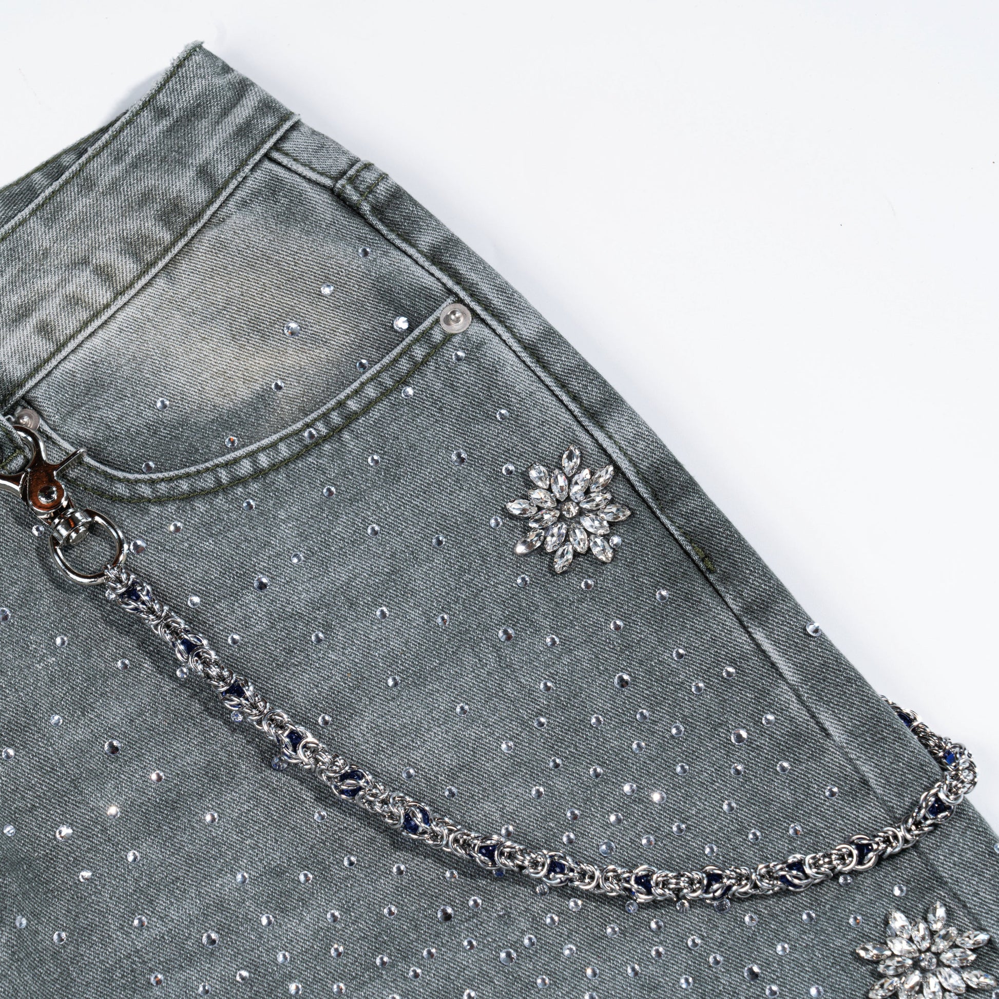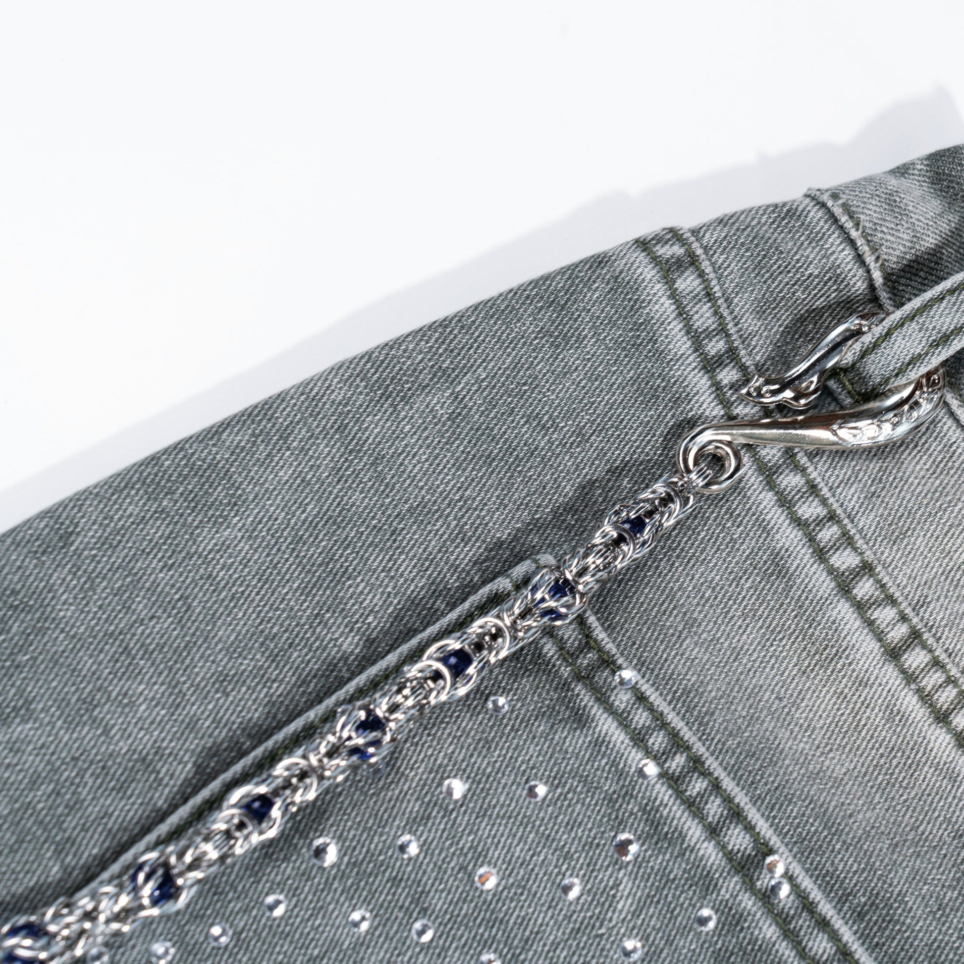 This pants chain has a silver base color and uses a weaving process to create a layered chain structure. Red decorative pieces are regularly embedded, adding distinct highlights to the whole and breaking the sense of monotony. One end is equipped with a delicately shaped hook buckle with decorative patterns, and the other end is a practical metal lock buckle. The design takes into account both fashion and practicality, and can add personality to the outfit. It is an eye - catching small item in a trendy look, easily enhancing the sophistication of the outfit.